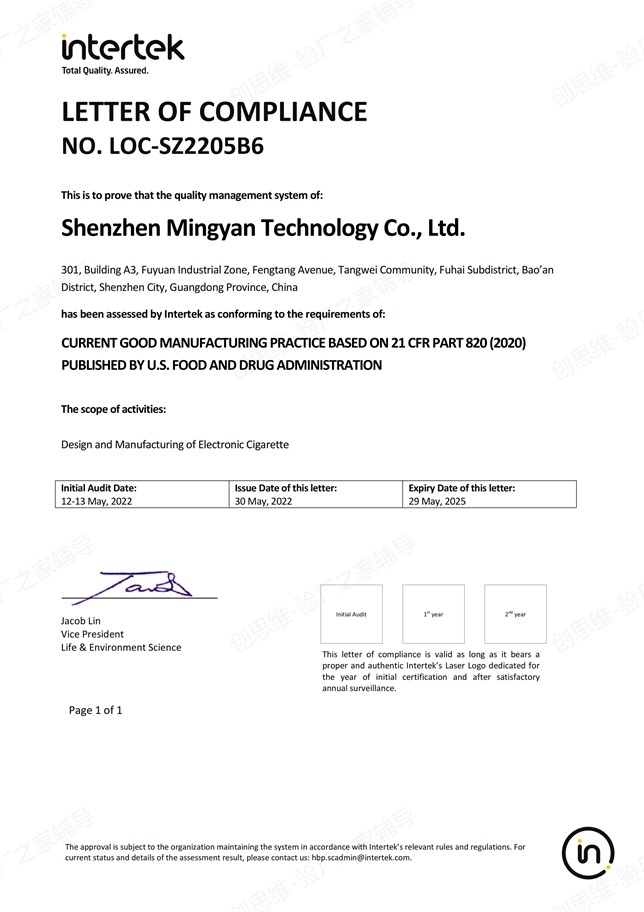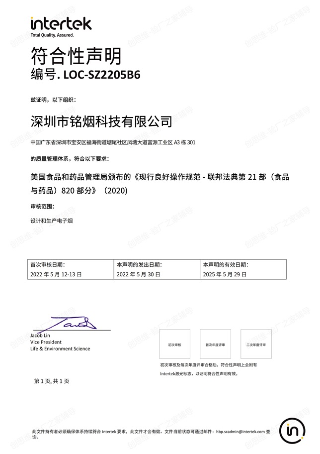 2022年5月12日-13日,國際認證機構INTERTEK(ITS) 專家及深圳市創思維企業管理技術有限公司技術經理、GMP輔導老師一起,對深圳銘煙電子煙、電子霧化器生產基地、煙油灌裝車間、包裝車間、成品倉庫、更衣室、化學品倉等進行了GMP 820認證現場檢查。經過2天嚴格、細致的檢查,順利通過檢查,并取得GMP-820認證證書。