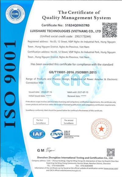 祝賀立訊技術(shù)(越南)有限公司 LUXSHARE TECHNOLOGIES (VIETNAM) CO., LTD 2024年快速通過ISO9001認(rèn)證