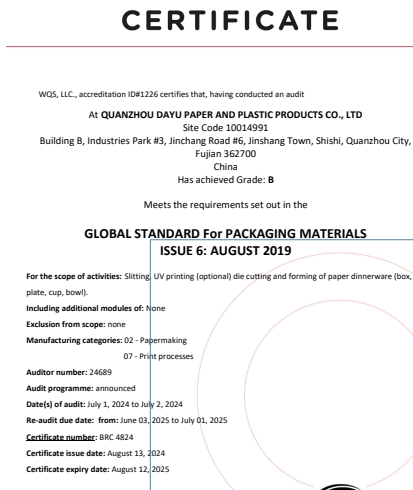 祝賀泉州大宇包裝制品有限公司2024年快速通過FSC認證、BRC認證、SEDEX-4p驗廠審核